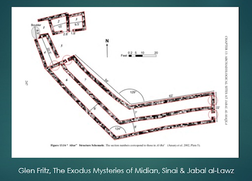 Moses Altar is located at the base of Jabal Maqla (Mount of the Quarry) that is the southern peak of Jabal Lawz (Mountain of the Almond) mountain range. This is considered the eastern side of the Lawz mountain range. It is said in the Bible, Exodus 24:4 “And Moses wrote all the words of YHVH. And he rose early in the morning and built an altar at the foot of the mountain, and twelve pillars according to the twelve tribes of Israel.” That is exactly what we find at the bottom of the mountain, uncut stones formed in a typical animal turn pin leading to a kill station, with cooking station, and a presenting boulder or two.