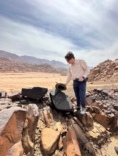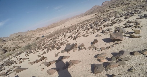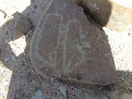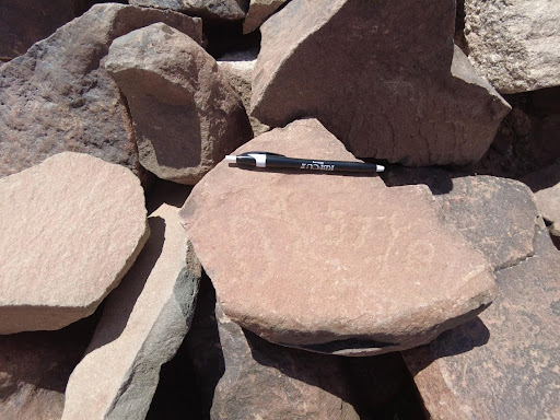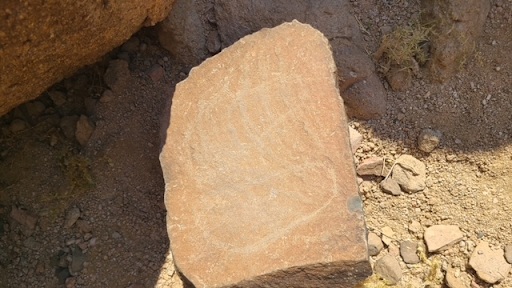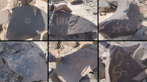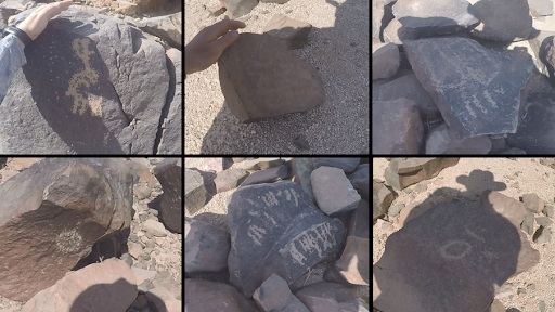 Located behind the split rock range are two large open plains with a slight incline to a hilltop/ridge between the plains. Near the top of the ridge there are mostly basalt rocks scattered all over. Scattered throughout the incline, rocks can be observed with petroglyphs of: scene depictions, sandal prints, archers, animals, shapes, Sabaean script, Proto-Siniaic script and precursors to the Hebrew script. The number of inscriptions on this ridge clearly demonstrates that a large number of people were at this location. Also noteworthy is that when observed these inscriptions are not done by the same person. There are distinct differences throughout as to style and tool.