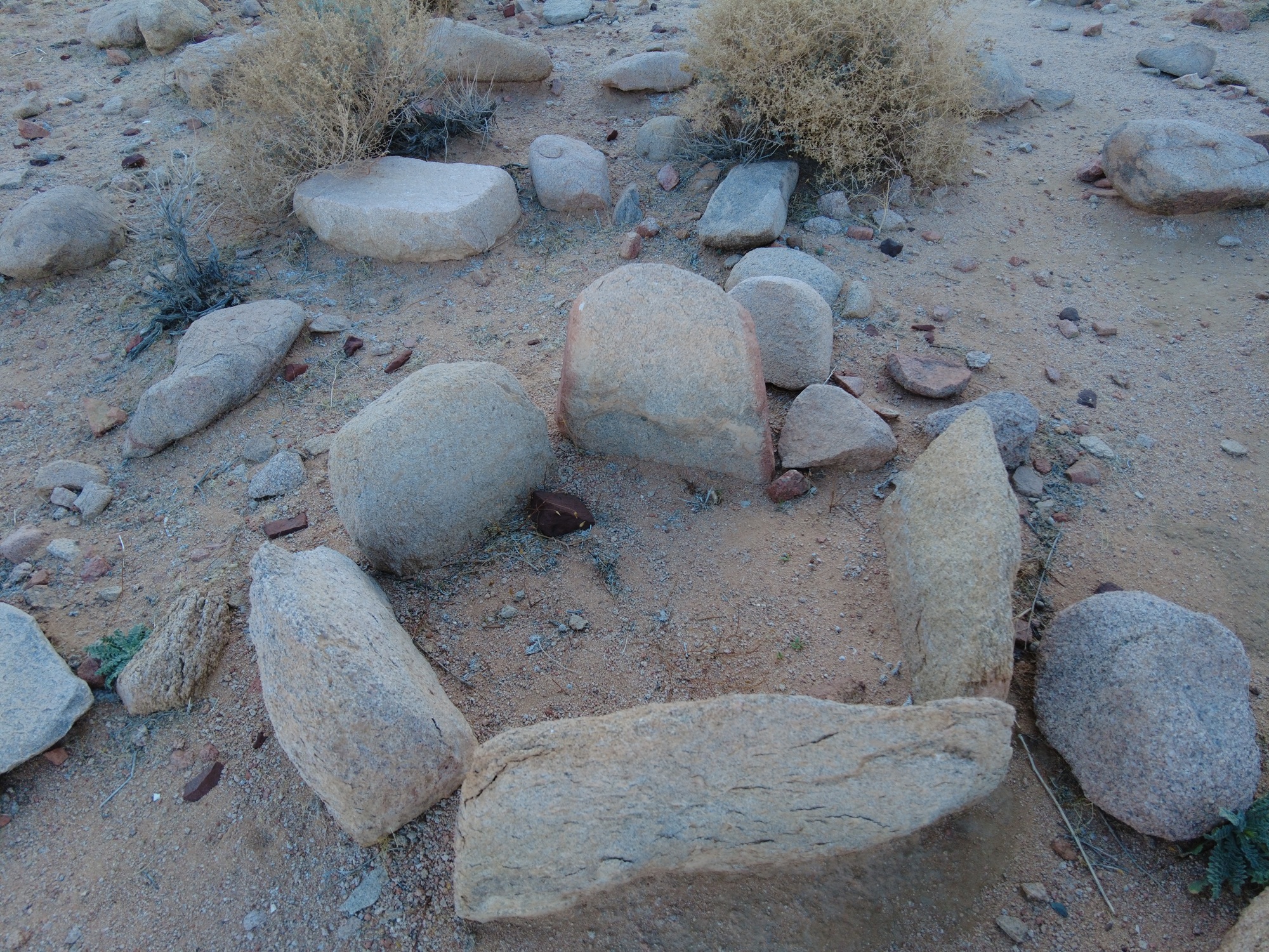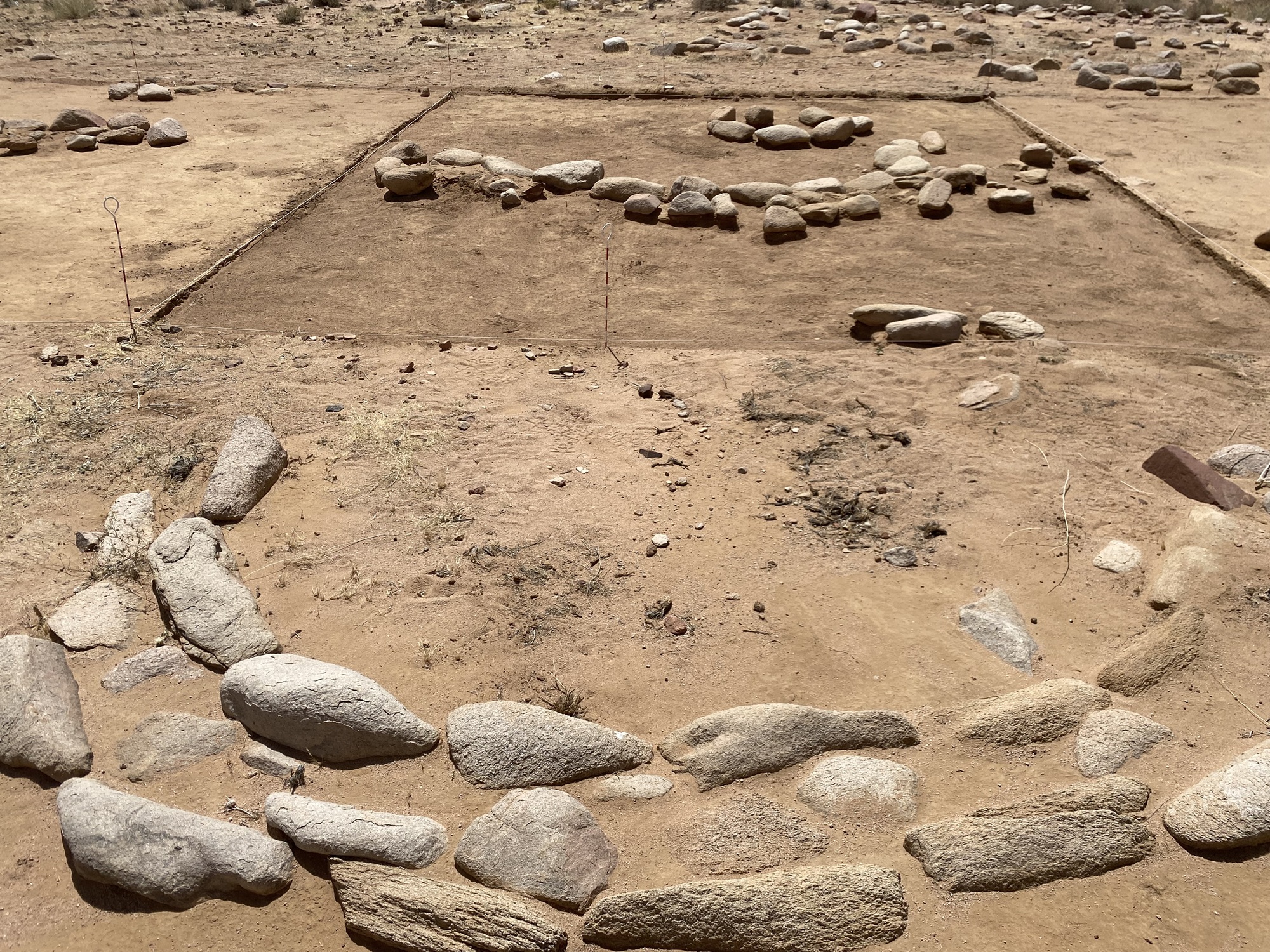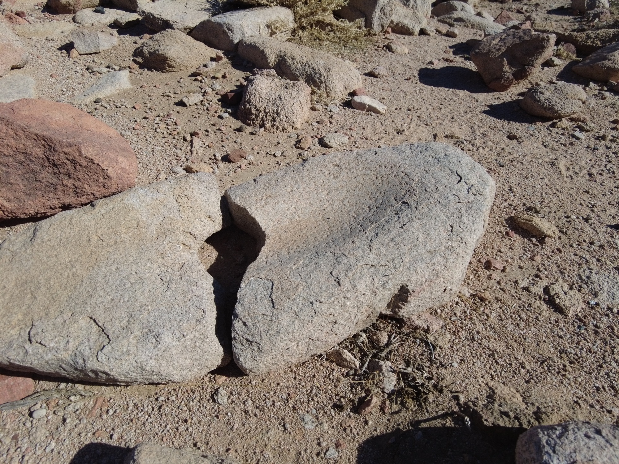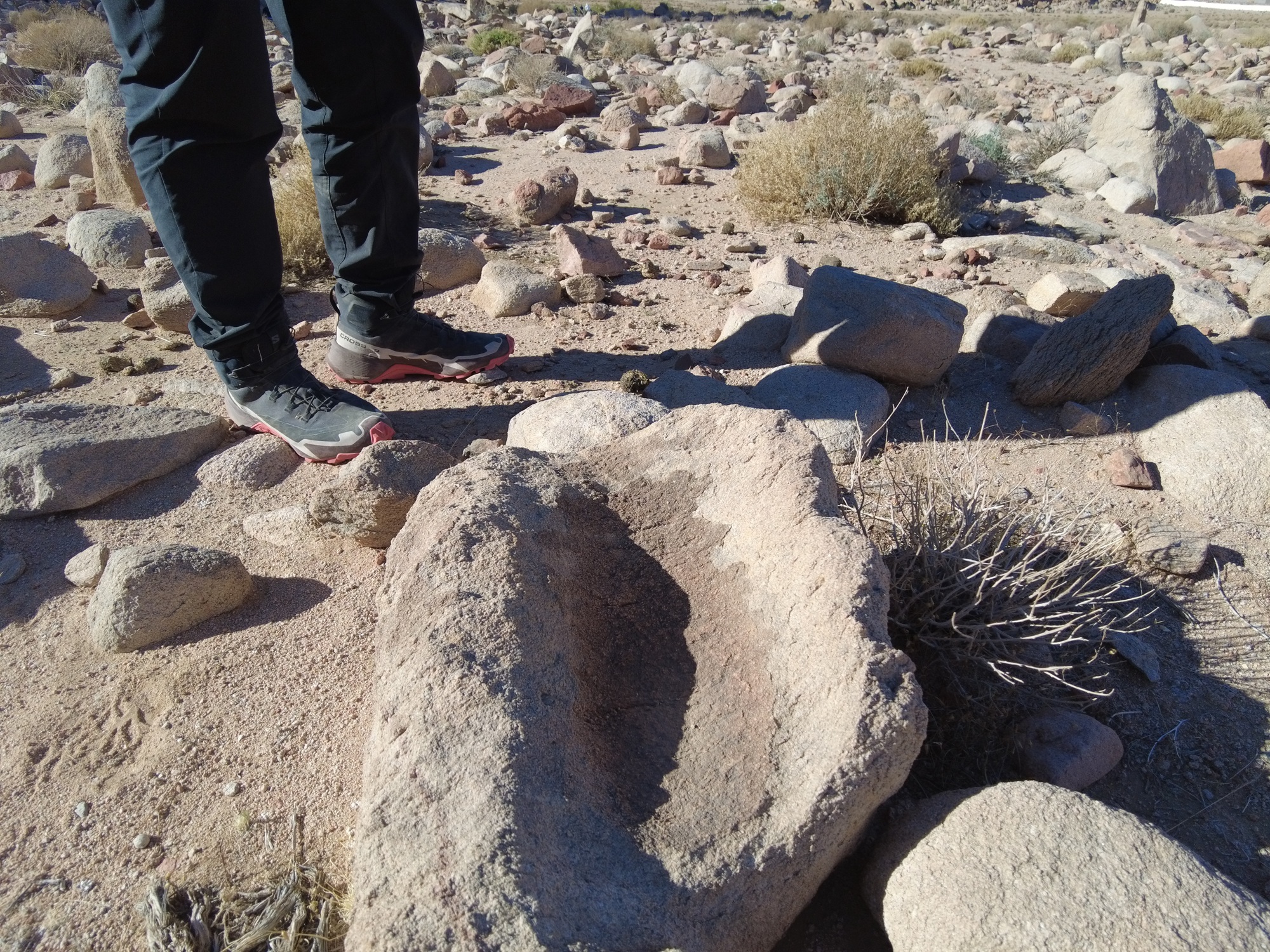 This cemetery has some interesting features that are unique when compared to desert burials from this region. Typical burials for desert people were piles of rocks in a circle form or mound. That is not what is found at this location. What is found is standing stones. A story that the Israelites would have been familiar with is their ancestor Jacob erecting a standing stone at the grave of Rebecca, Genesis 35:20 “And Jacob set a pillar on her grave, which is the pillar of Rachel’s grave to this day.” Also there are stone placements in the shapes of decoration and walking paths. Another most curious find along with these burials is grinding stones and grinding stone bases. These were left behind with the people who were buried at this location. Could this be the tools used to grind the manna? Why did they leave these behind with the buried ones? Were these considered unclean due to the plague that broke out in the camp?
