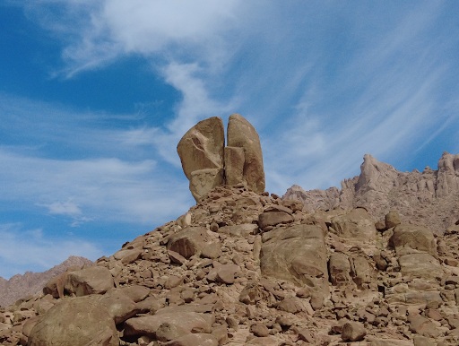The location of this site is near the location of the Amalekites to the northeast. Biblically pairing there would need to be appropriate proximity to the Amalekites so that they would be able to come and attack the Israelites. The location of this rock fits the description of the Amalekites coming in from behind and attacking moving in from the north. It makes sense for the Amalekites to then turn their attention to the Israelites in this area. As the area does not have a lot of water, having and controlling a water source in this region would be very powerful and even life or death for a people. The Split Rock location is not far from Mount Sinai which is fitting with the order of events in the Bible.