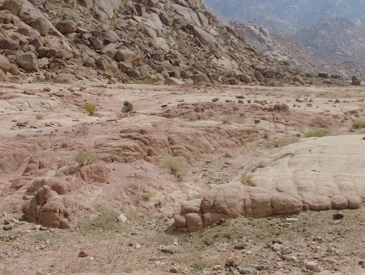 The Split Rock of Horeb is Located to the north of Jabal Lawz. This structure is a 60+ foot tall rock that is situated on a large hill. This hill and giant rock was pushed by the formation of a water fissure. At some point this structure erupted with water quickly forming a small lake. It is unclear when or how long this water flowed but the evidence on the ground still shows the reminisce of a lakebed. When the water burst forth it split this rock and the divisions and channels were still there. It is also important to note that it is a very old structure and there is some wind damage but the majority of the erosion was caused by quickly moving water.